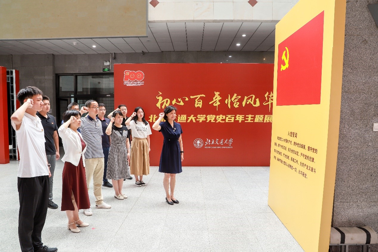 党支部党员首先参观了“初心百年恰风华——北京交通大学党史百年主题展览”,党组织书记闻映红带领党员在党旗下庄严宣誓,重温入党誓词。闻映红结合自身在交大学习和工作经历,为大家讲述交大党史百年历程。