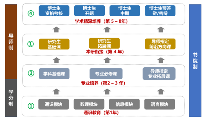 学院贯通本博“1+2+1+4”培养体系,分段强化通识基础、专业深耕与科研创新,实施“一生一案”个性化培养,融入国际顶尖学术资源,打造基础扎实、学科交叉、前沿视野的科技创新领军人才。