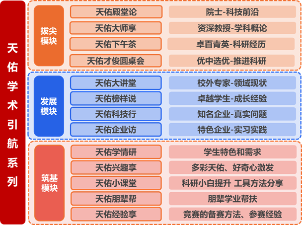 学院构建“天佑学术引航”矩阵,下设拔尖、发展、筑基三模块,联动校内外资源举办前沿活动157场,覆盖7400余人次,满意率超95%。