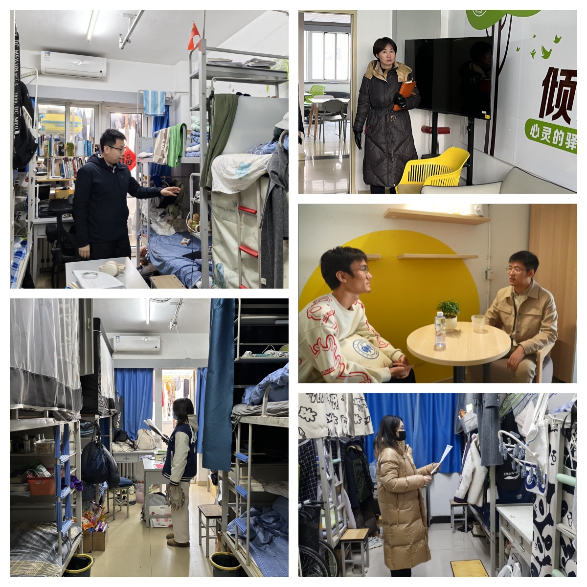 2024年12月至2025年1月期间,学院学生工作组全体辅导员在王新羿的带领下多次不定时深入学生宿舍走访,重点关注学生宿舍用电安全、公共环境卫生及期末复习情况,排查潜在风险隐患,建立宿舍安全稳定风险台账,对存在潜在风险的宿舍责令限期整改,确保宿舍安全。