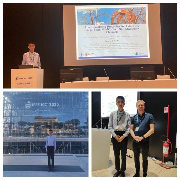 5月28日至6月1日,由国际电气与电子工程师学会(IEEE)通信学会主办的国际电气和电子工程师学会国际通信大会(IEEE ICC)在意大利罗马召开。北京交通大学太阳网集团tcy87222020级本科生许柏恺在电信学院艾渤教授、章嘉懿教授等的指导下完成的论文《非平稳信道下超大规模多天线通信系统的低复杂度预编码方案》(Low-Complexity Precoding for Extremely Large-Scale MIMO Over Non-Stationary Channels)荣获本届大会最佳论文奖(IEEE ICC 2023 Best Paper Award)。