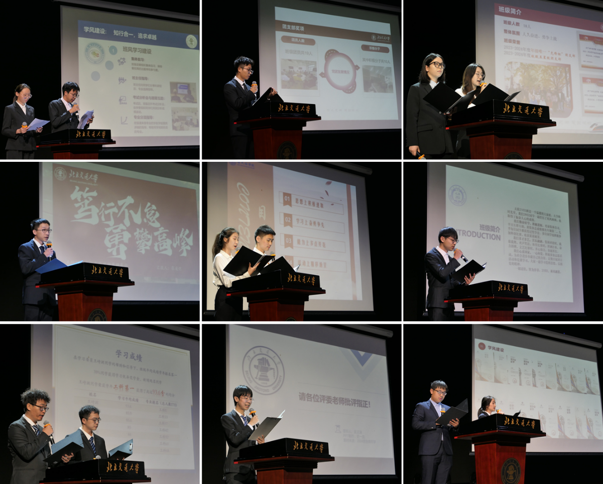 大会首先进行了优良学风班答辩,经过前期评选规则制定、报名宣讲、答辩指导和资格审查等环节,最终共有9个班级参与答辩。各班负责人按照抽签顺序依次上台,分别围绕学风建设、思想引领、组织建设和班级特色活动几个方面就上一年度班级建设情况进行了汇报。