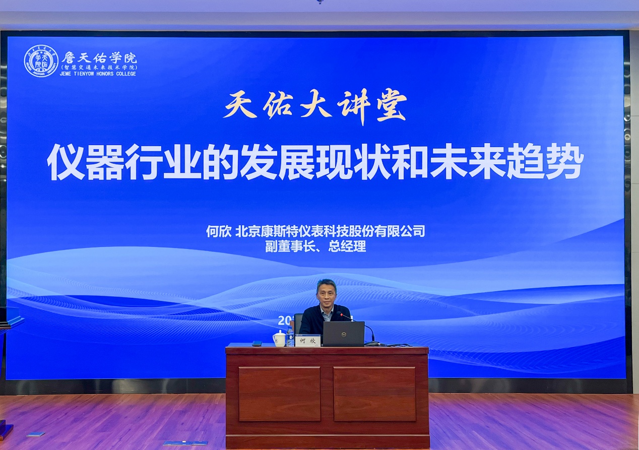 何欣总经理从自身创业经历出发,首先介绍了康斯特公司的主要产品和主营业务,梳理总结了仪器仪表行业的发展历程,分析了当前我国高端仪表产业所面临的挑战和未来发展方向,分析了当前国际形势变化对我国制造业的影响。他勉励同学们,要扎根细分领域,不断精进技术,提高自身技术水平才能在世界变化大潮中站稳脚跟,同时鼓励同学们要抓住机遇,要充分相信中国制造在高端市场的巨大潜力,希望同学们能够立志成才,引领未来科技发展。