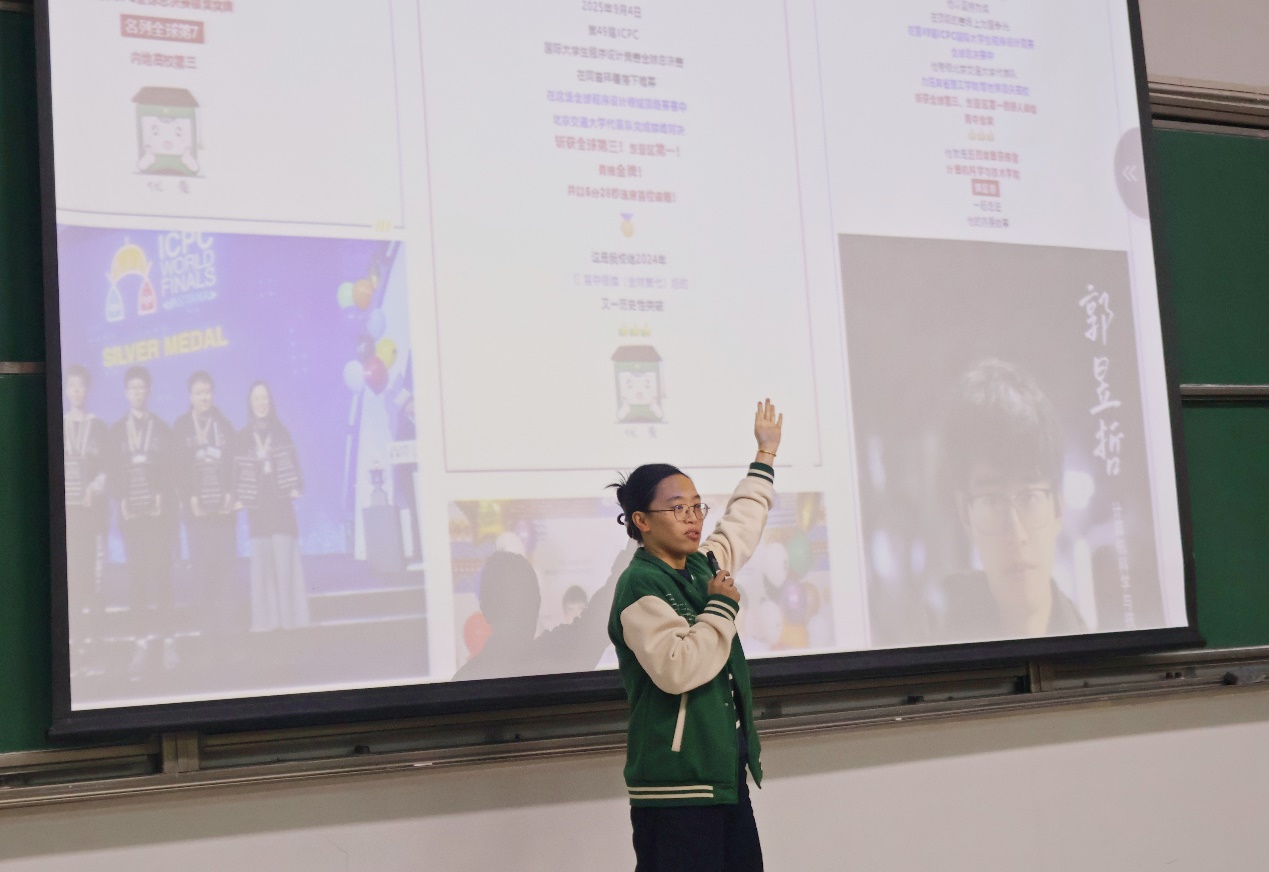 许华婷分享了带领北交大团队在第49届ICPC全球总决赛中斩获全球第三的拼搏历程,介绍了计算机程序相关竞赛的项目、流程,鼓励同学们以兴趣为引,勇于提问、勤于实践,用过硬的本领拥抱AI时代。