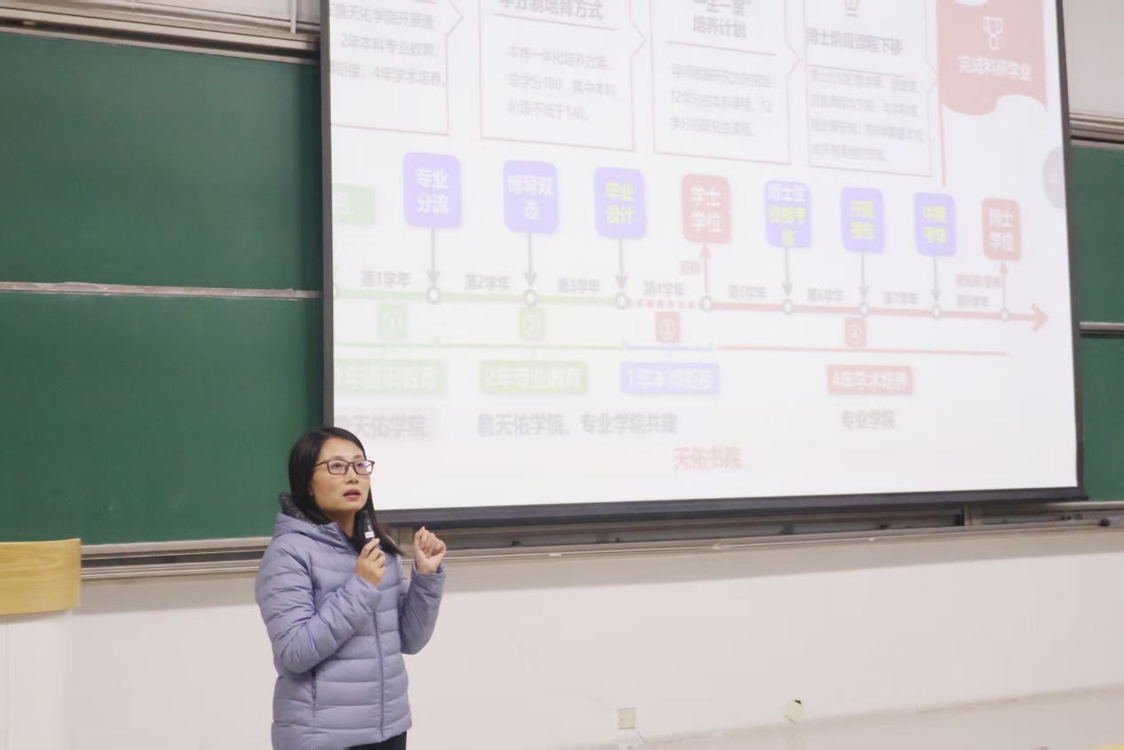 史红梅系统解读“1+2+1+4”本博贯通培养方案,明确本博八年专业分流、博导双选、本研衔接、博士毕业等关节节点安排、要求和设计逻辑。她以“天佑学术导航”系列为例,详细介绍了学院整合校内外资源支持学生生涯规划、高效学习、卓越学术的支持体系。她鼓励同学们慎独笃行,立科研报国之志,修格物致知之本领,担民族复兴之大任。