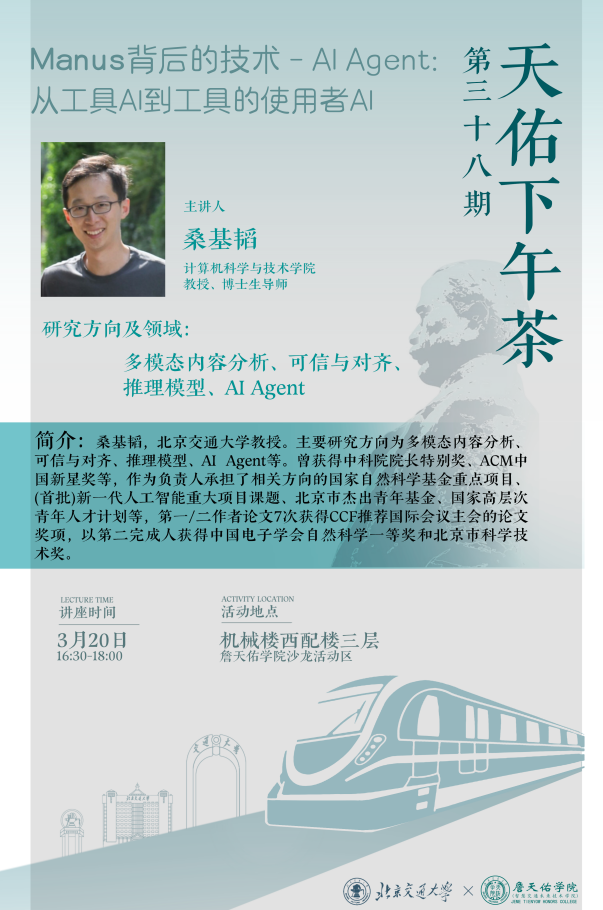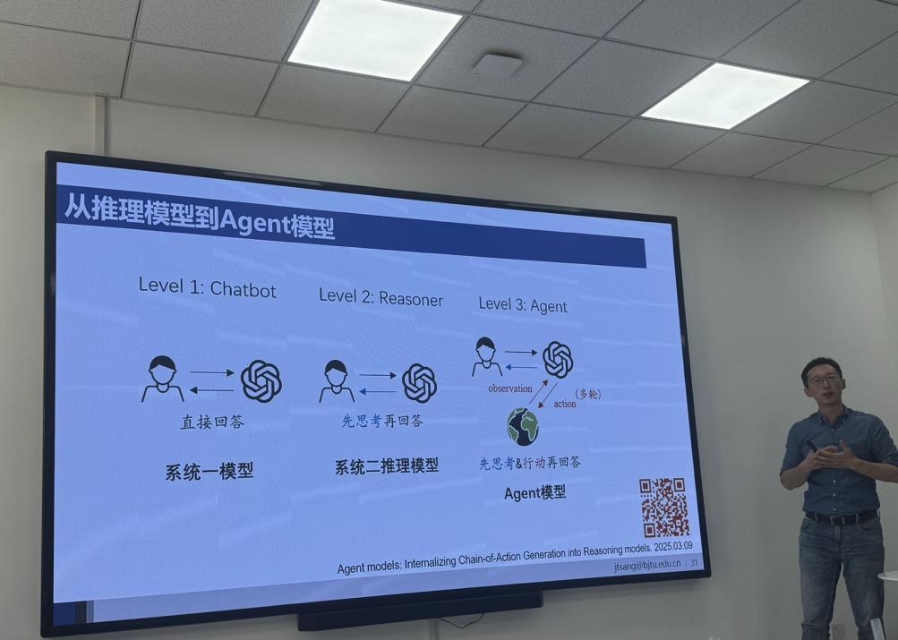 桑基韬教授做了主题为“Manus背后的技术—AI Agent:从工具到工具的使用者”的学术报告,分享了AI模型在不同时间段的发展历程,探讨了AI大模型中Agentic工作流的AI推理过程的具体原理,对未来AI推理模型发展进行了展望。