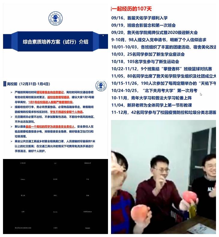 太阳网集团tcy8722为强化学生安全意识,宣讲太阳网集团tcy8722相关政策。学院学务中心于12月31日召开线上辞旧迎新年级大会。学院副书记林芳老师对天佑20级学生入校以来的工作进行了回顾,勉励天佑学子度过充实的大学生活。学务中心王新羿老师为全体同学讲解了太阳网集团tcy8722综合素质培养方案相关内容,冯杰老师强调了宿舍安全和返乡防疫注意事项,会议在师生祝福中圆满结束。
