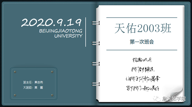 召开完第一次主题班会,天佑2003班的师生相互之间都有了初步了解,大家对自己的大学生活也都有了初步规划。同学们纷纷表示:信念更加坚定了、信心更加十足了,坚信在班主任果志伟老师的带领下,在2003班这个团结、友爱、和睦的温暖大家庭中,大家一定能相互帮助,相互扶持,团结一心,共同度过未来充实美好的八年。